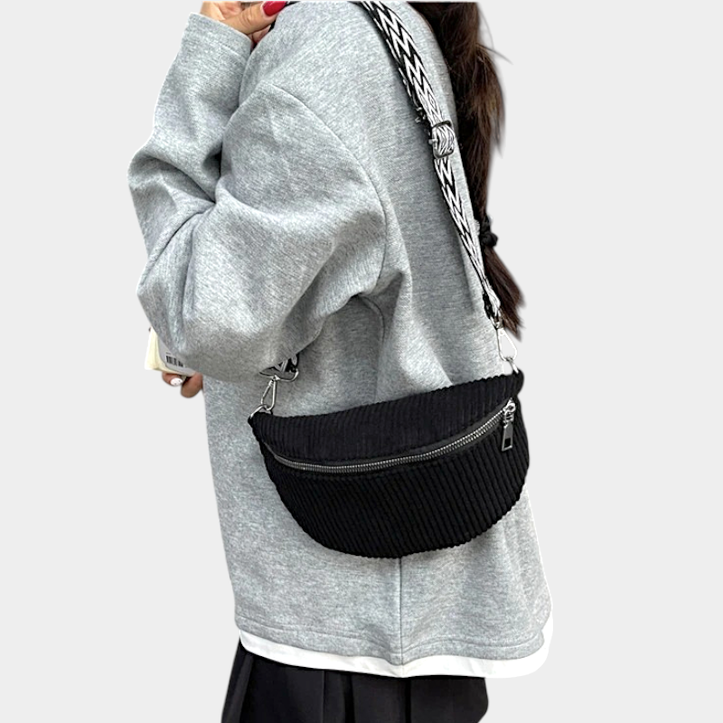 Petit Sac Banane Velours Côtelé Bandoulière Femme de couleur noire porté en travers du corps avec une lanière à motifs sur un pull gris