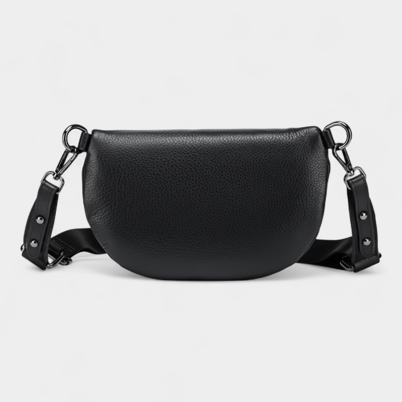 Avec sa silhouette demi-lune ce sac revendique un style urbain minimaliste affirmé légèrement rock discret avec ses finitions en métal chromé noir. Son design épuré rehausse instantanément toutes vos tenues, du matin au soir, en apportant une touche contemporaine.