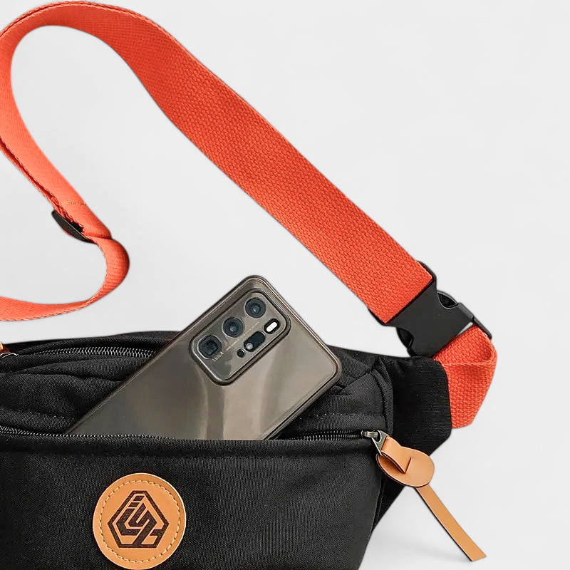 sac banane homme tendance noir et orange porté en bandoulière par un homme