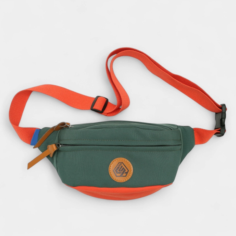 sac banane homme tendance vert et orange porté en bandoulière par un homme