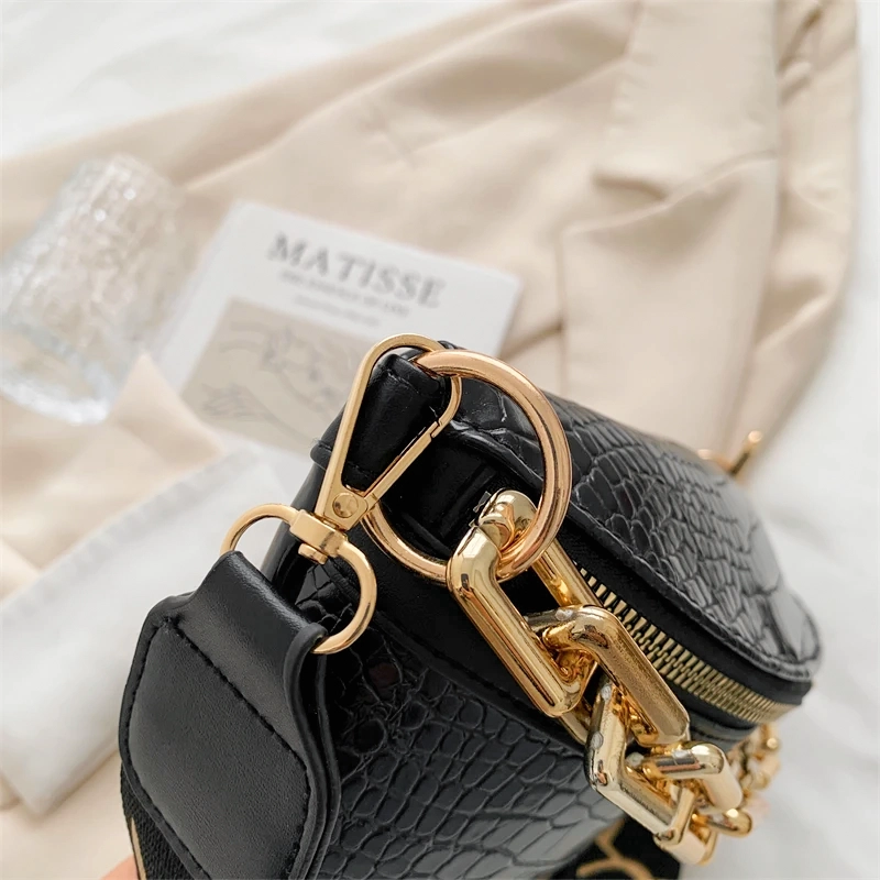 Ce sac se démarque par une esthétique audacieuse, portée par la brillance de la chaîne dorée et le cuir croco. Il s’adapte aux styles urbains, affirmés ou casual chic, ajoutant une note de personnalité à chaque tenue.