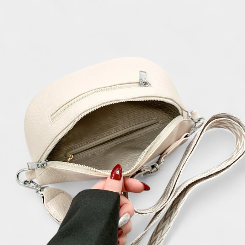 Ce modèle intègre une organisation bien pensée avec deux poches zippées pour vos indispensables : une grande pour ranger portefeuille et téléphone, une avant pour garder à portée de main clés ou billets. Tout est conçu pour un accès rapide et une sécurité renforcée lors de vos déplacements.