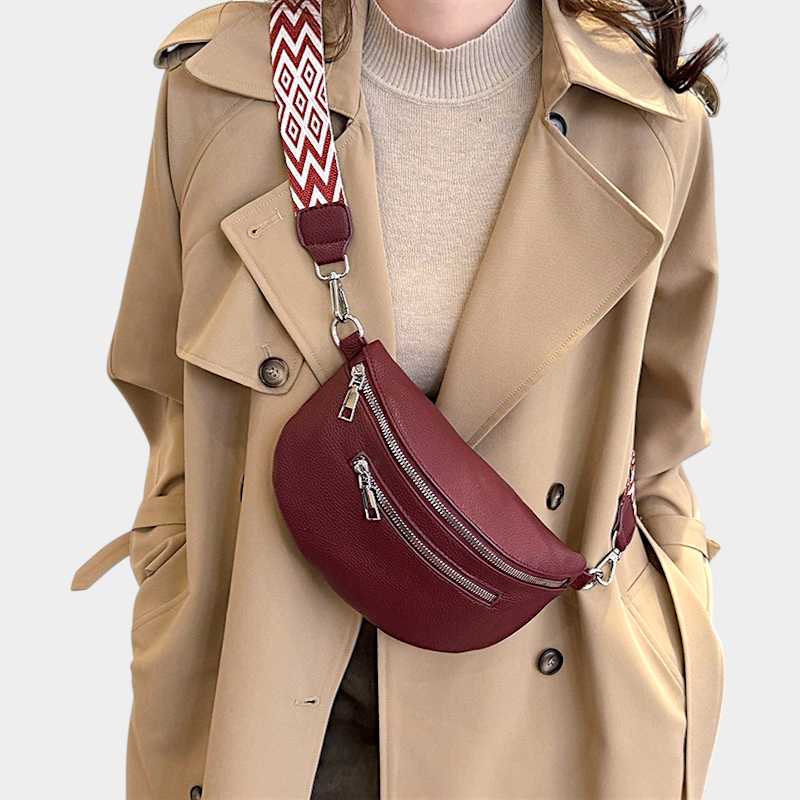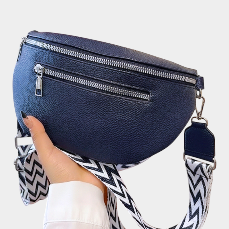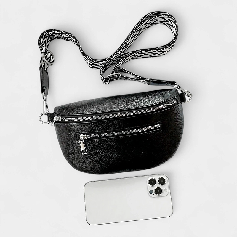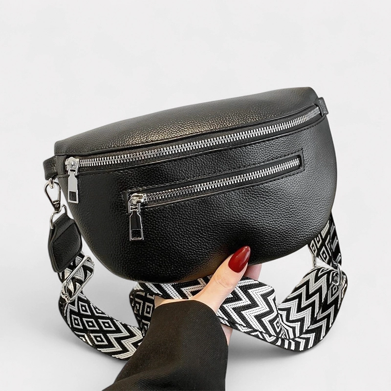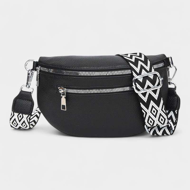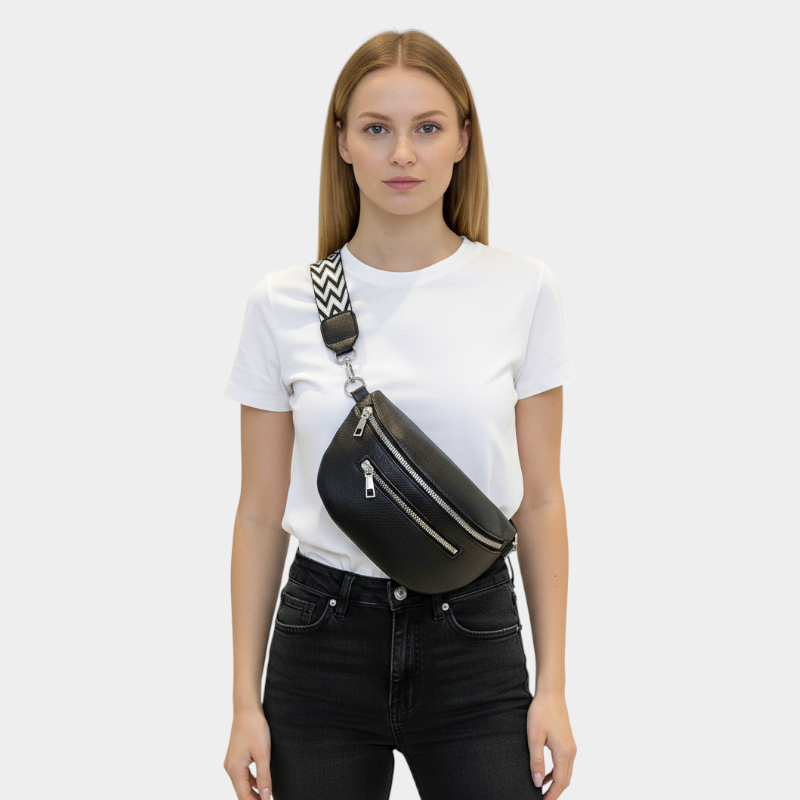 Le Sac Banane Sangle Interchangeable se démarque par son look à la fois rock et chic. Sa fermeture éclair chromée et sa bandoulière interchangeable géométrique ajoutent du caractère tout en restant sobres et faciles à assortir à vos tenues du quotidien.
