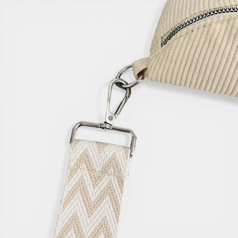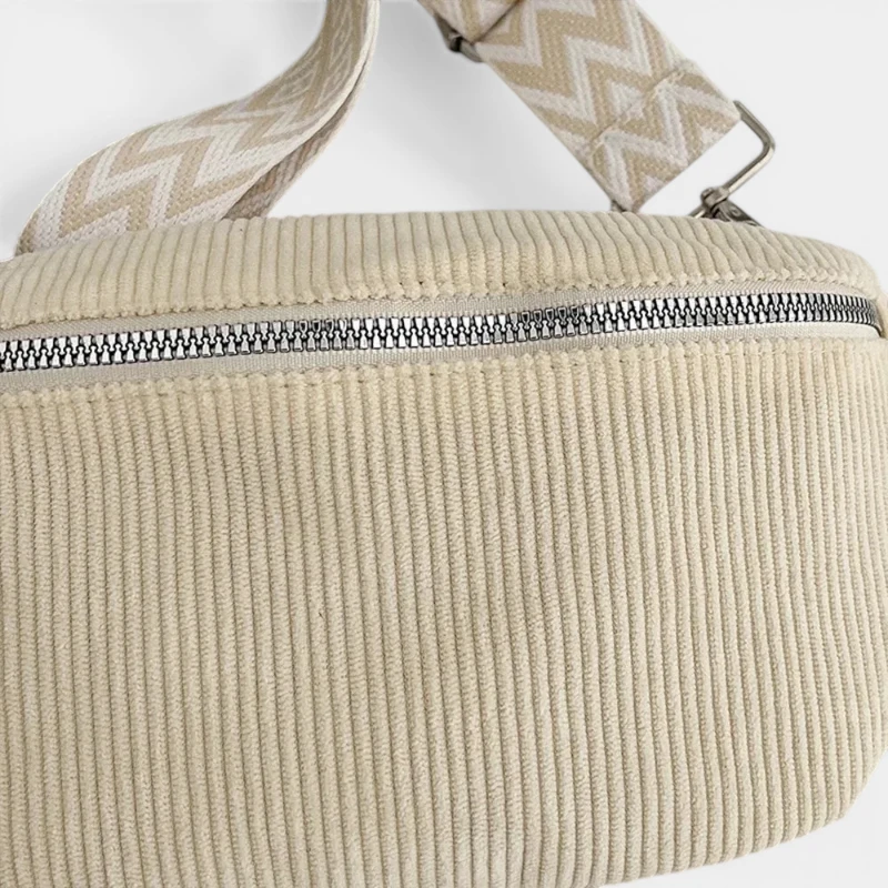 Sac banane velours côtelé beige porté en bandoulière par une femme au style chic, avec sangle à motif chevron