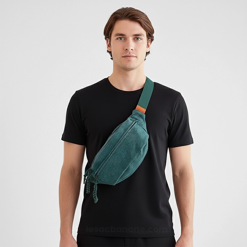 sac banane velours côtelé vert porté en bandoulière par un homme